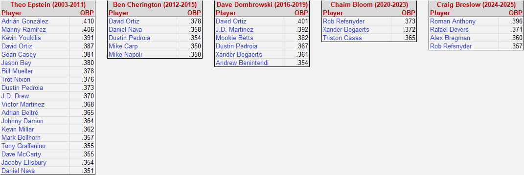 Here is a chart of the “elite” OBP players during the five front offices since John Henry has owned the team (minimum 50 games):