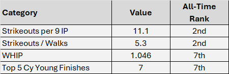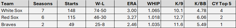 Over the next 5 seasons, Sale only started 56 games due to a variety of injuries, including Tommy John surgery in 2020. After the 2023 season, with one year left on Sale’s contract, Craig Breslow became the Red Sox CBO and decided to trade him to the Braves for Vaughn Grissom. I had mixed feelings, as I’m sure many Red Sox fans did. I loved the guy, but could he overcome his injury history and be an effective pitcher again? Boy did he show us. His 2024 was nothing short of spectacular, leading the NL in wins, ERA, strikeouts, and K/9, and earning his first Cy Young award. He followed up with a very good 2025 but started only 20 games.