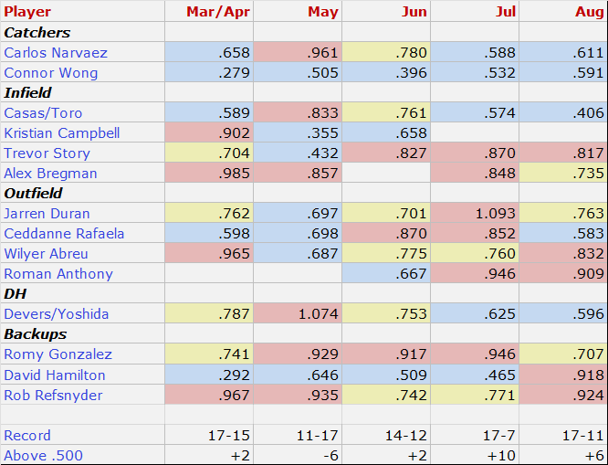 Ceddanne Rafaela needs to step it up. He showed us what he can do in July. He needs to be that guy again. Soon. Duran has been hot and cold, currently cold. Bregman needs to return to his early season form. Wilyer Abreu is good when he plays but is starting to have an injury history. Right now, Story is their most consistent everyday performer, with Romy and Refsnyder against lefties.