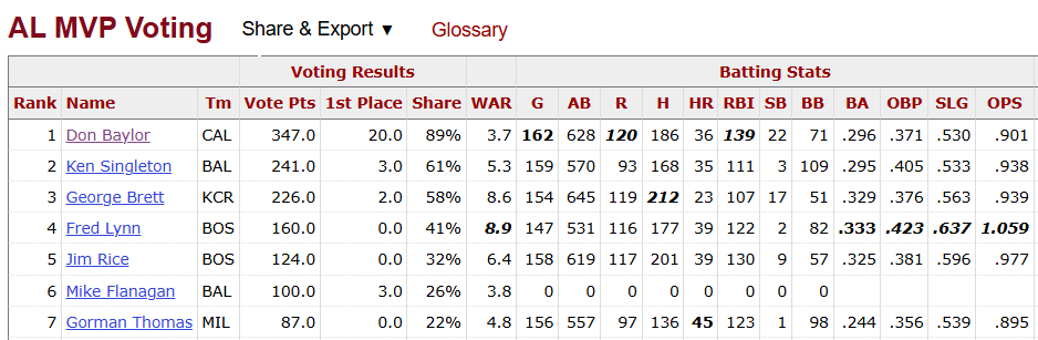 Don Baylor won the MVP with a 3.7 WAR. Yes, you read that right, but WAR was not even a glimmer in Bill James’ eye at that point. Baylor also led the league in runs scored and RBIs. Fred Lynn not only led the league in WAR, BA, OBP, SLG, and OPS, he won a gold glove as well. This was an historic season by an all-around great player, and he finished fourth. But back in those days, it was all about home runs and RBIs.