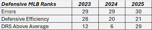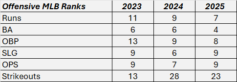 The Red Sox improved slightly in terms of offense over the last two years but have consistently been a top 10 offense. Their best hitter in ’23 and ’24 was Rafael Devers. Without him in 2025, there were enough contributors to keep the offense moving. Contributions from Bregman, Story, and Anthony were solid. Duran, Rafaela, Abreu, and Yoshida were very streaky, as was the entire offense. This needs to even out going forward, if that is even possible.
