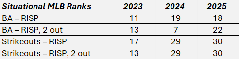 Situationally, the Red Sox took a step back in 2024 and were even worse in 2025. The Red Sox were a middle of the pack team in 2023 but in ’24 and ’25 they were lower third in batting average with RISP and dead last in strikeouts with RISP.
