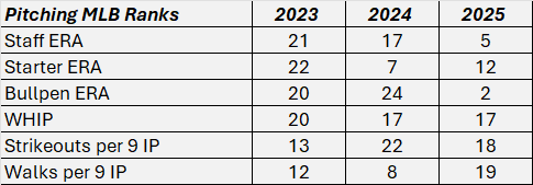 I do think the poor WHIP, K/9, and BB/9 numbers are a concern. The pitching staff did not have enough swing-and-miss stuff, and they allowed too many baserunners. If not corrected, this could come back to bite them in 2026.