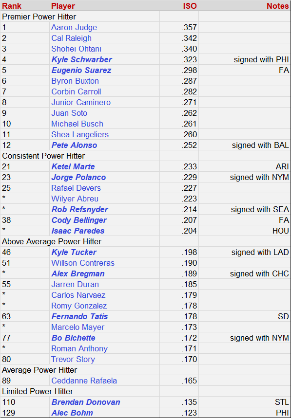 The following table shows the top 12 leaders in ISO for 2025, all finishing in the premier power hitter category. I also listed members of the current Red Sox and other hitters that were either free agents or rumored to be Red Sox trade targets. The ranks are among qualified MLB hitters. A * denotes that player was not qualified.