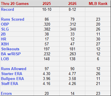 The lack of power is still evident. The Red Sox are 26th in slugging percentage and 30th in home runs, both well below their pace last year. Yes, you read that right. The Red Sox have hit 12 home runs in 20 games, 6 by Abreu and Contreras. Those of us who criticized Craig Breslow’s failure to acquire a power hitter were shouted down by the most optimist faction of Red Sox Nation, especially after the WBC. “Don’t worry, the power will come!” they said. OK, we’re still waiting. One bright spot is situational hitting. They are hitting a very respectable .263 with RISP, good for 12th in the majors. They are also leaving fewer runners on base.